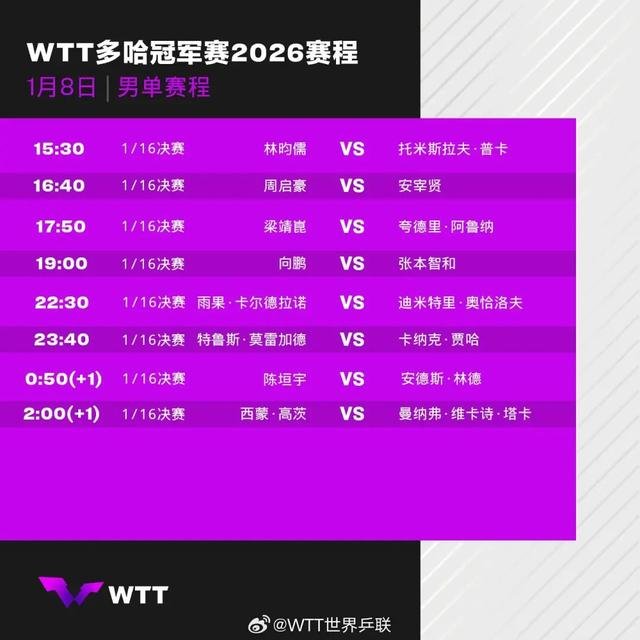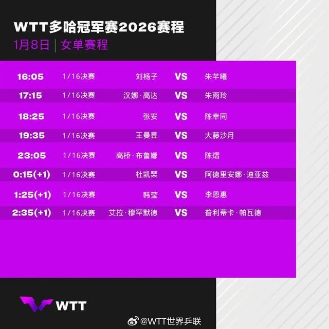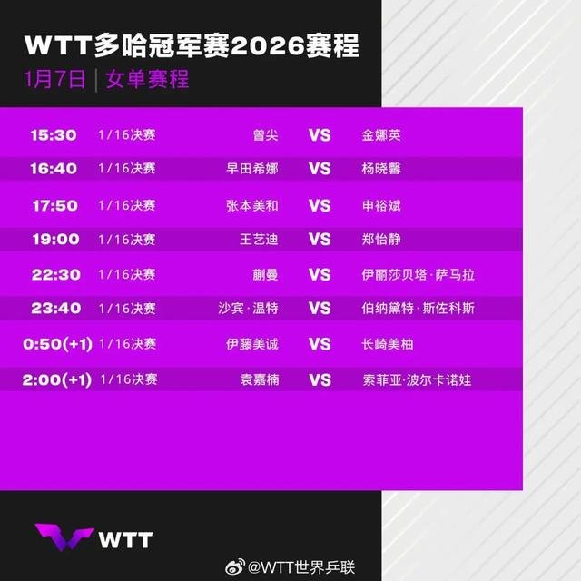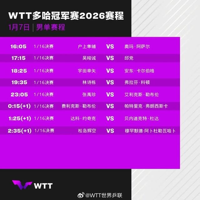 2026年WTT多哈冠军赛将于1月7日至11日在卡塔尔多哈卢赛尔体育馆举行,男女单打各32名选手参与角逐。