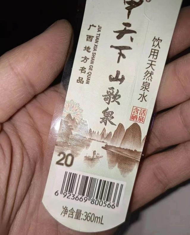 近日,有网民反映广西某矿泉水包装标签印有与20元人民币背面相似的图案,引发质疑。