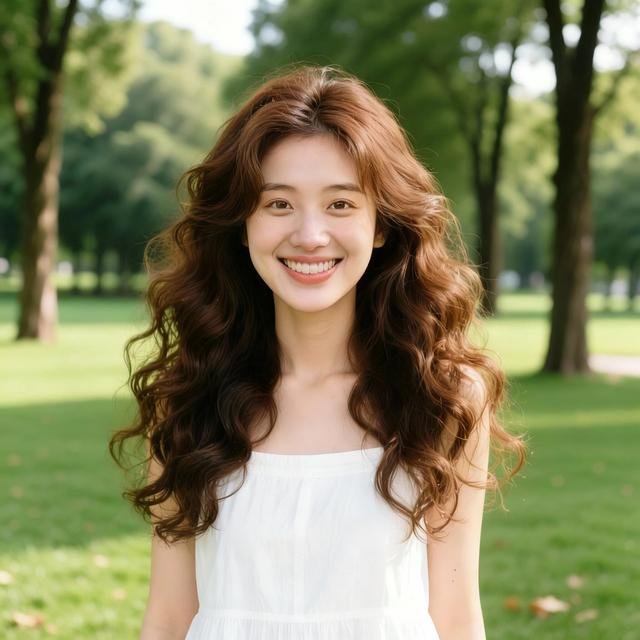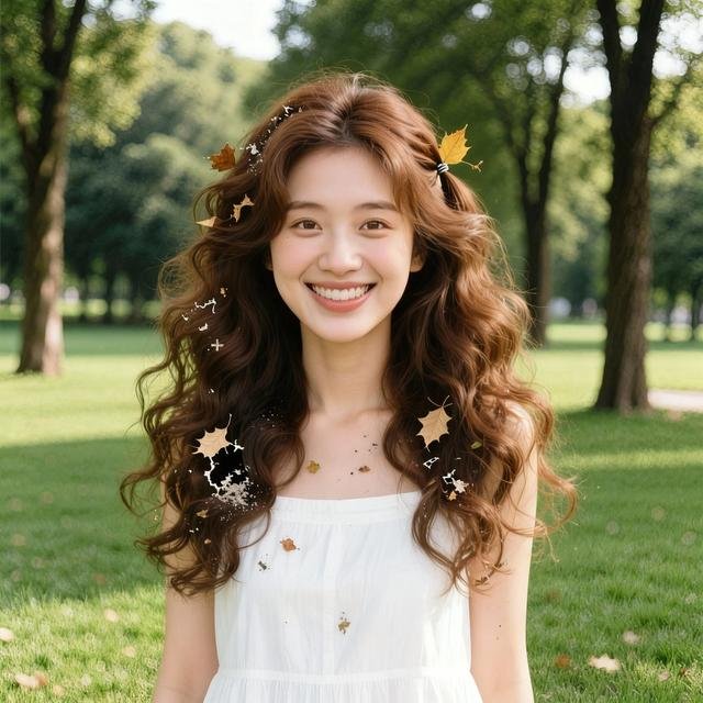 【原图生成描述(直接复制用)】:年轻女性,棕色大波浪卷发(发型整体蓬松自然),头发上沾有少量树叶、灰尘等杂物,还有几处头发空缺处(扎头发留下的痕迹),白色连衣裙,在户外公园正面站立微笑,背景为绿色草坪 + 高大乔木,光线为晴天柔和自然光,发丝清晰可见,画面比例 1:1