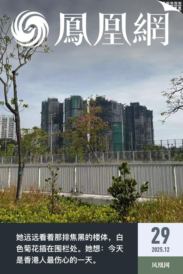 因为有朋友住在附近,火灾发生前,罗女士就熟悉这里,知道这栋楼已有四十多年的历史。此刻,她站在街心公园,看到那排建筑已被红色警戒线封锁,与她一街之隔。她远远地望着,把买来的白色菊花插在银色围栏处。她在心里想着:今天是香港人最悲伤的一天。