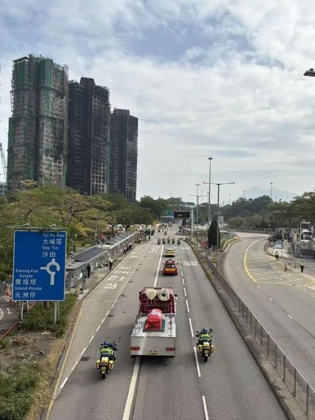 当天上午,不少香港市民和罗女士一样,聚集在宏福苑附近的天桥和公园,等待灵车抵达进行路祭。一位老太坐在街心公园的长椅上,低声哭泣,不远处,三位女士相拥在一起。“他好伟大,我们走出来,他要走进去呀。”罗女士红着眼睛说。她特意请假半天,赶来宏福苑为这位消防员诵经。