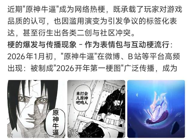 2026年初,一张来自《火影忍者》的漫画表情被重新配上“原神牛逼”四个字,短短几天内便在网络上传播开来,仿佛病毒一样扩散至各大平台。