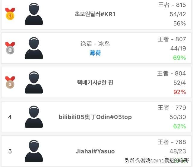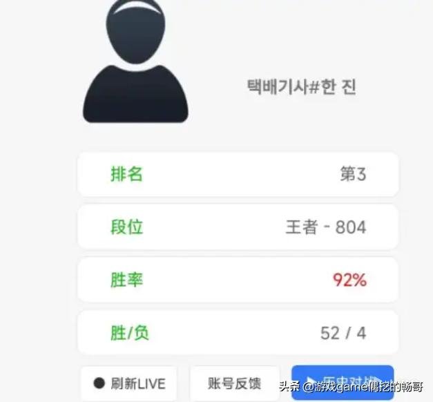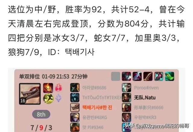 一个没有备注的神秘账号,在1月8号深夜首次亮相,从钻石大师分段起步,两天内打了56场排位,以52胜4负的成绩登顶,胜率高达95%,如今稳居韩服第一,拥有804分的王者战绩。