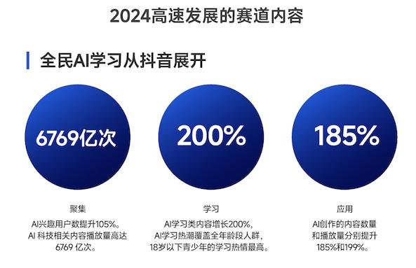 AI 的创造力在抖音得到充分展现,AI 内容数量和播放量分别实现 185% 和 199% 的增长,AI 正逐步成为内容创作的新趋势。