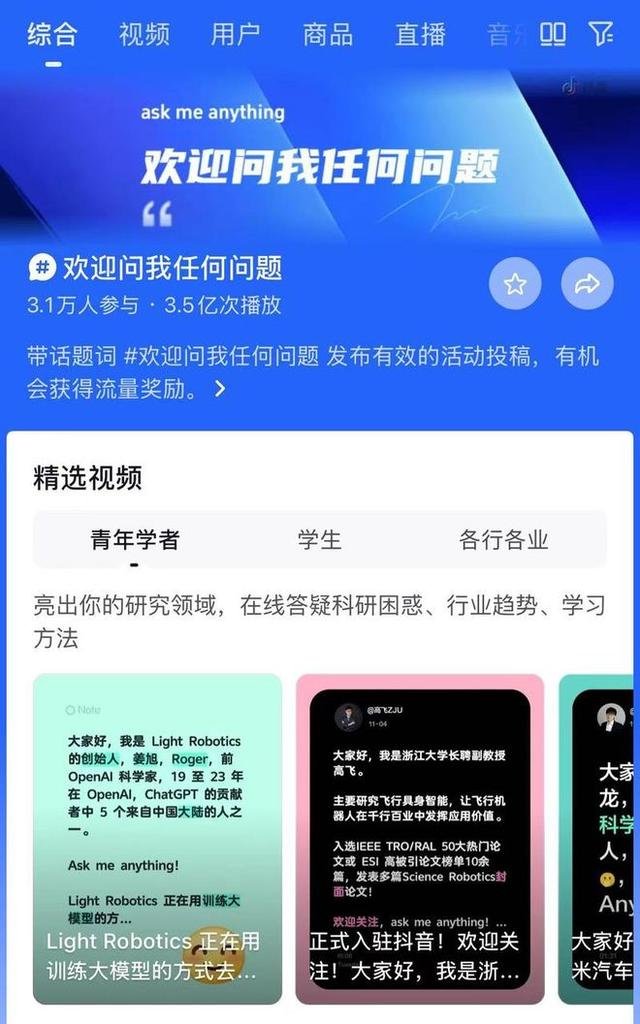 以前遥不可及的专家学者,如浙江大学高飞副教授、前 OpenAI 科学家姜旭,现在也在抖音上“摆摊问问题”,在评论区答疑解惑,互动风趣。