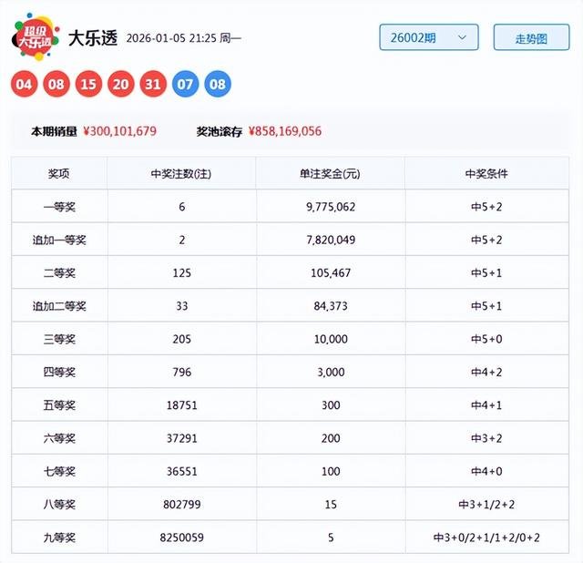 大乐透第2026002期开奖号码为:04、08、15、20、31+07、08。前区奇偶比为2:3,三区分布为2:2:1,大小比为2:3,后区呈现一奇一偶的组合。