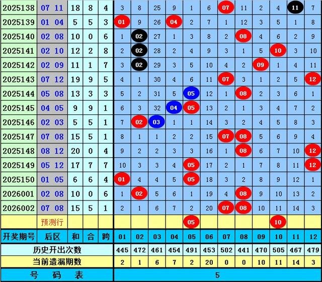 后区第一位预测:近5期开出号码为08、05、01、02、07,平均值为4.6,奇数号码近期表现较热,预计本期仍可能再次出现,推荐号码05。
