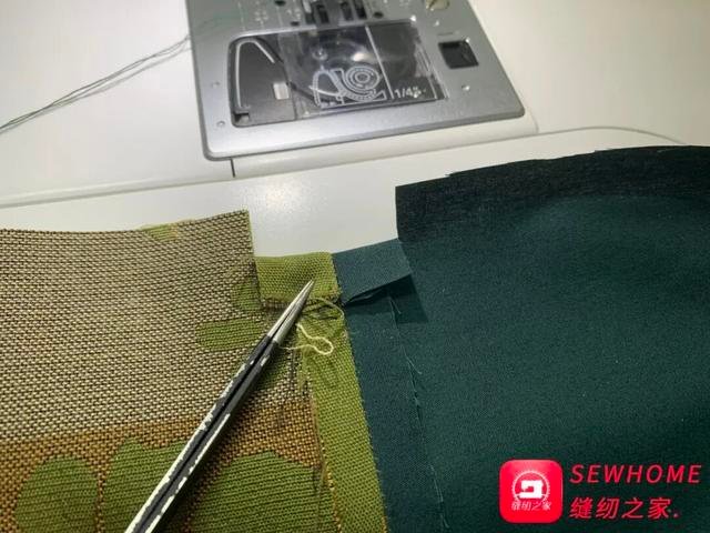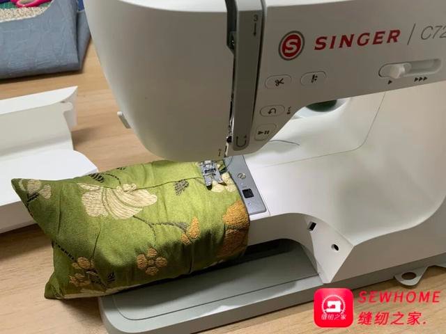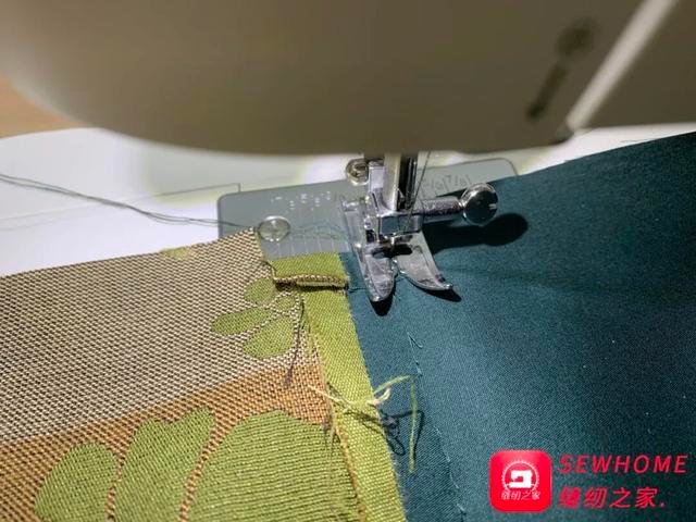 卸下缝纫机的附件盒,用套筒缝纫方法在袋口压线,宽度约1.5厘米。