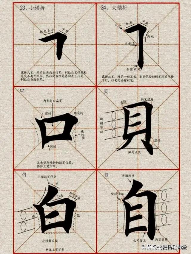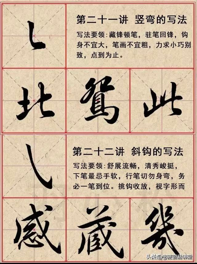 该课程以“笔画分解+实例演示”为核心模式,实现了书法技巧的直观教学。在笔画分解部分,对每种基础笔法的起笔、行笔、收笔都进行了详细说明:书写右点时,强调“露锋入纸、按笔铺毫、向右下收笔”的操作要点;书写斜钩时,明确“流畅自然、一气呵成、挑钩收放依据字形调整”的核心要求;即便是横折、竖提等复杂笔法,也会细化到“转折处的顿笔角度”“提笔时的力度控制”等细节。这些说明将无形的运笔动作转化为清晰的文字和线条指引,使初学者能够准确掌握每个运笔环节。