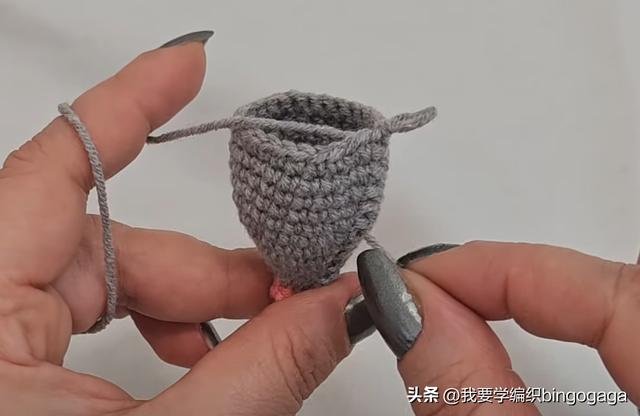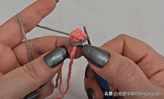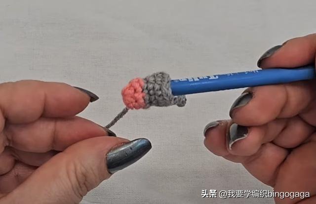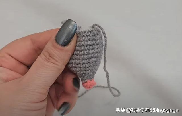 首先从老鼠的脸部开始编织,使用A线起针。第一圈:环起,钩6个短针,引拔,每圈都进行引拔;第二圈:不增不减钩6个短针,最后换B线引拔;第三圈:使用B线,不增不减钩6个短针;第四圈:重复(1针,1针内钩2短)*3组,共9针;第五圈:重复(1针,1针,1针内钩2短)*3组,共12针;第六圈:重复(3针,1针内钩2短)*3组,共15针;第七圈:重复(4针,1针内钩2短)*3组,共18针;第八圈:重复(5针,1针内钩2短)*3组,共21针;第九圈:重复(6针,1针内钩2短)*3组,共24针;第十至第十四行:不增不减钩24个短针。