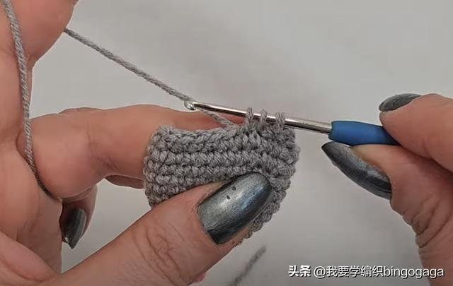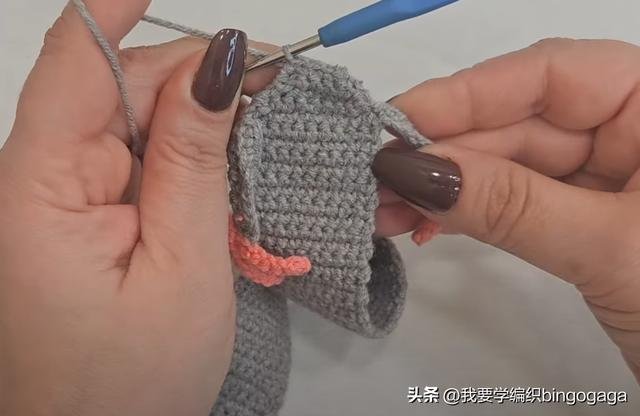 接下来继续向后挑锁针钩短针,最后一针锁针上钩引拔针,然后继续不加不减钩短针至结束;接着再钩12针锁针,按相同方式完成另一边。然后1锁针翻面,中间处同样钩1放2,中间不加不减钩短针,来回翻面不加不减钩短针,直到长度约为17厘米(可根据书本大小调整)。