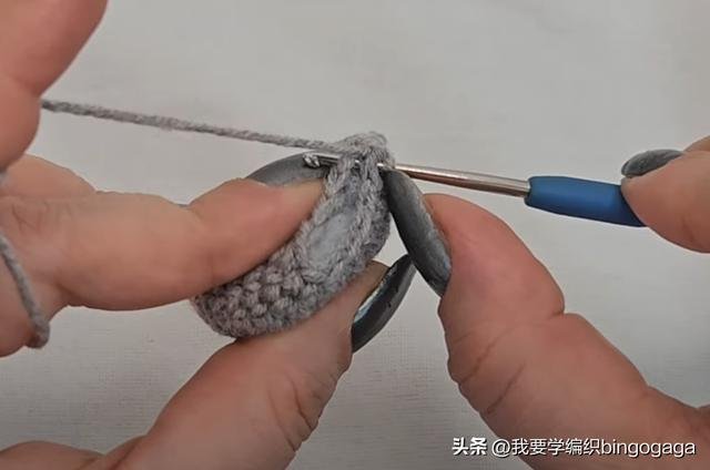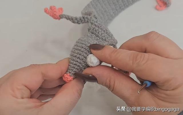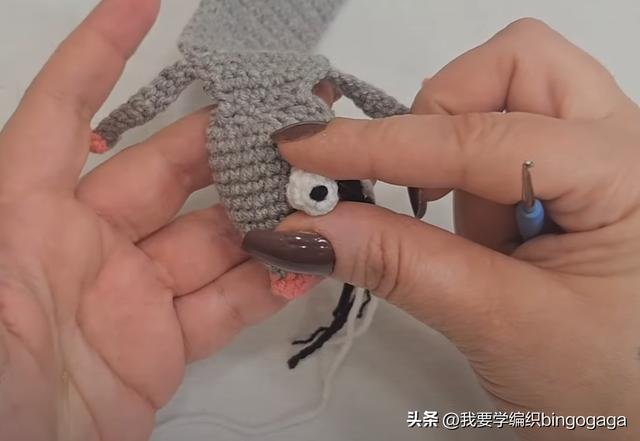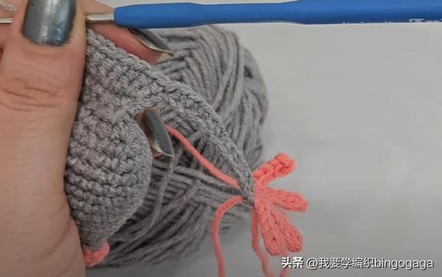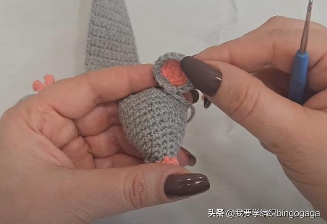 接着换C线钩眼睛,第一圈:环起,钩5个短针,引拔;第二至第三圈:不增不减钩5个短针,断线;然后再钩一个。眼珠:连续打两次结,缝到眼睛上。再来钩耳朵,第一圈:A线,钩5个短针,引拔;第二圈:每针里钩2短*5,共10针,引拔;第三圈:(1针,1针内钩2短)*5,共15针;最后换B线引拔;第四圈:B线,(4针,1针内钩2短)*3,共18针,断线;然后再钩一个。最后将这些部件与鼠头缝合,全部完成后,这款独特的鼠标书签就完成了!