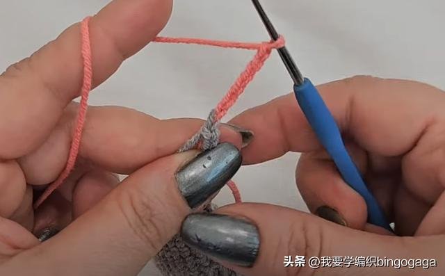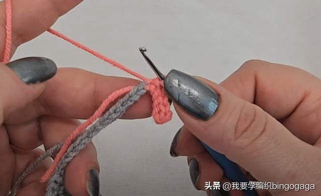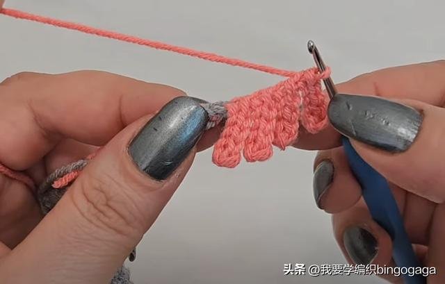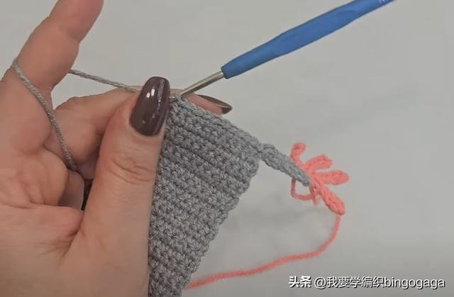 接着钩11针锁针,换A线钩出,再重复(6针锁针,倒入第2针钩1短针,4针引拔针)*4次,再依次向左挑3条线钩出,换B线一次性引拔。然后穿入带子,不加不减钩短针,再钩11针锁针,按同样的方法完成另一边,之后翻面减针,每行头尾各减1针,直至剩下3针,断线。然后换A线,在第一针上钩1短针,再钩23针锁针,倒入第2针依次钩6针引拔针,8针短针,8针中长针,穿入第3针短针上引拔。