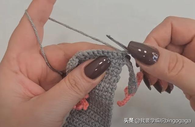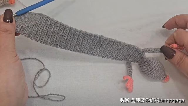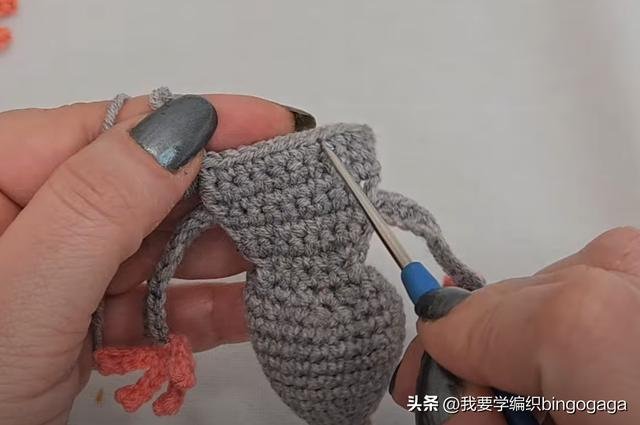 第十五行:重复(1针,1针,2针并一针)*6组,共18针,然后填充棉花;第十六行:重复(1针,2针并一针)*6组,共12针;接着将织物捏扁,平分为两部分,对齐后钩短针拼接。第十七行:1锁针翻面,头尾针上钩1放2,中间不加不减钩4短针,共8针;接着钩12针锁针,换A线钩出,再钩6针锁针,依次倒入第2针钩1短针,再钩4针引拔针,之后重复(6针锁针,倒入第2针钩1短针,4针引拔针)*3次,再向左挑3条线钩出,换B线一次性引拔。