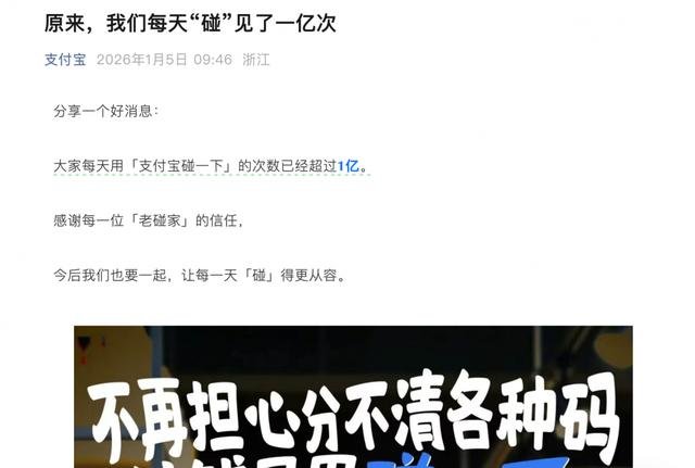 【TechWeb】1月5日讯,支付宝官方公众号发布消息称,支付宝“碰一下”功能的日支付次数已超过1亿次。