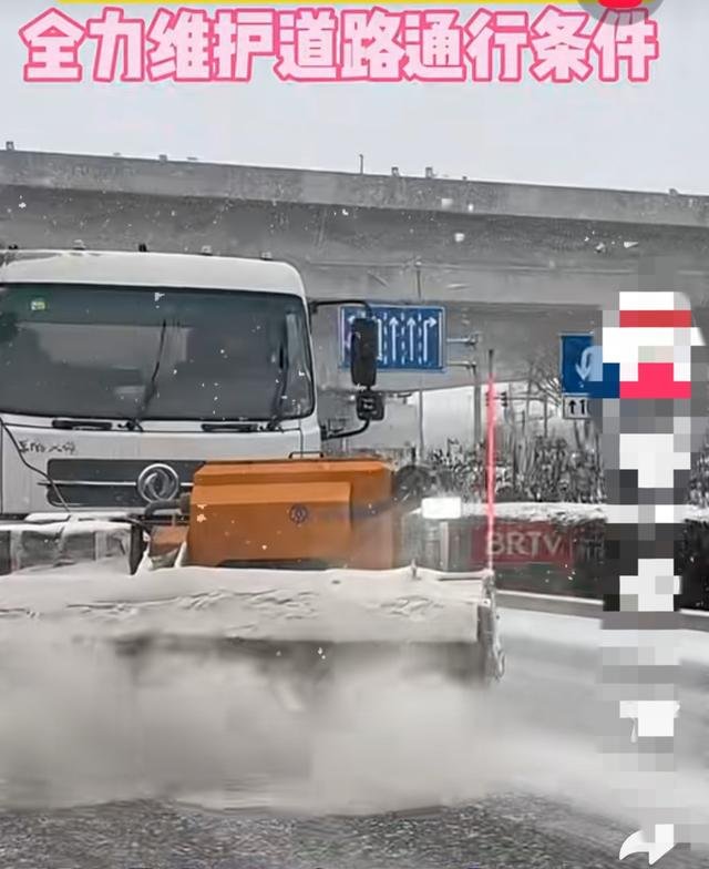 途中看到一台大型扫雪车,中间区域的积雪已经被清理干净,边缘仍有部分在作业,这是第一次见到如此大规模的扫雪设备,旁边还摆放着警示锥桶,让人感叹中国在应对极端天气方面的创新与效率。