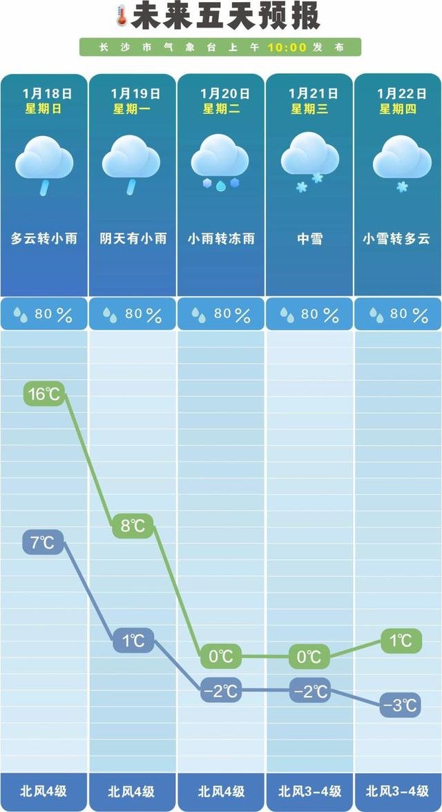 根据长沙市气象台发布的未来五天天气预报,18日(周日)长沙仍为多云转小雨,气温在7℃至16℃之间;但从19日(下周一)起,一股强大的“寒冷力量”将席卷而来,天气迅速变化,长沙阴天伴有小雨,气温骤降至1℃至8℃;20日(下周二)小雨转冻雨,气温进一步下降至-2℃至0℃;21日(下周三)迎来中雪,最低温度维持在-2℃;22日(下周四)小雪转多云,长沙持续低温,-3℃至1℃,整个城市仿佛被“冻结”,正式进入“冰窖”状态。