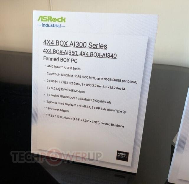 除了展示英特尔产品外,华擎工业还推出了基于 AMD 平台的 4X4 BOX AI300 系列。该设备外观与 NUC 机型相似,但核心配置来自“红队”阵营。