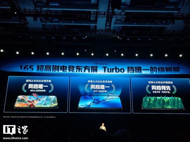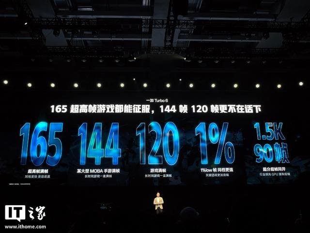 IT之家从发布会现场获悉,一加 Turbo 6 还率先实现 Turbo 档 165 / 144 / 120 三档满帧玩,成为同档唯一支持《王者荣耀》原生 144 帧模式的机型,可实现 3 小时持续满帧游玩。