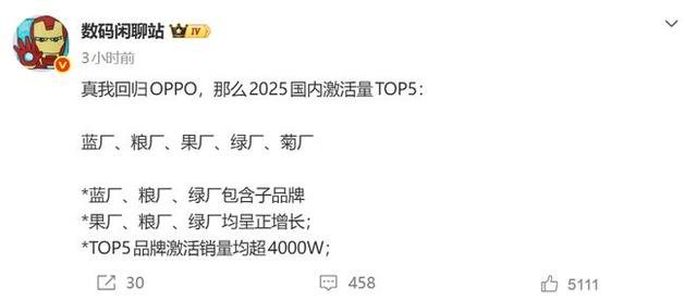 1月7日,知名数码博主“数码闲聊站”发布消息指出,真我重新加入OPPO后,2025年中国智能手机市场的前五大品牌依次为:vivo、小米、苹果、OPPO和华为。