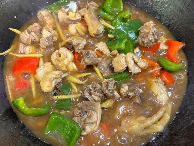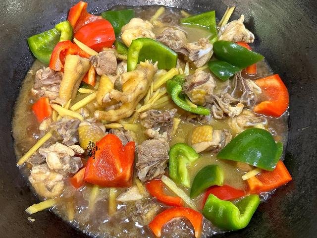 食材:半只三黄鸡,红、绿彩椒各一个,姜片,老抽,蚝油,鸡精,盐,淀粉水,料酒,食用油。