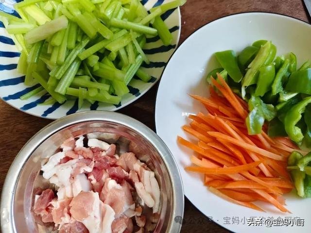第一步,选用肥瘦适中的猪肉来炒这道菜,口感更佳。先去掉猪皮,然后将芹菜叶子摘掉,茎部洗净。青椒和胡萝卜也要清洗干净,无需去皮。