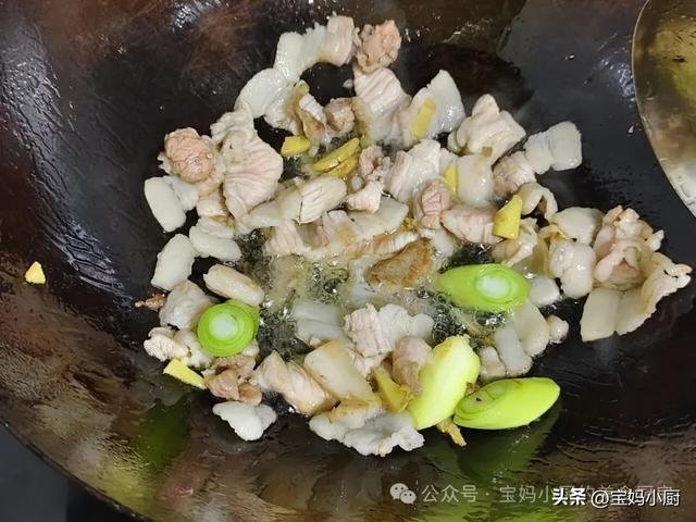 第四步,使用铁锅,先大火加热至冒烟,然后转小火,加入适量植物油,放入肉片翻炒至变色,接着加入葱花和姜末,中火煸炒出香味。热锅凉油有助于防止粘锅。