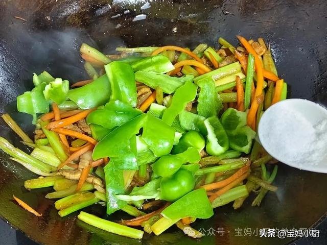第六步,当肉炒出香味后,即可开始炒蔬菜。先放入芹菜,中大火煸炒至软塌,再加入胡萝卜丝和青椒块,根据口味加盐调味,最后大火翻炒至青椒断生。